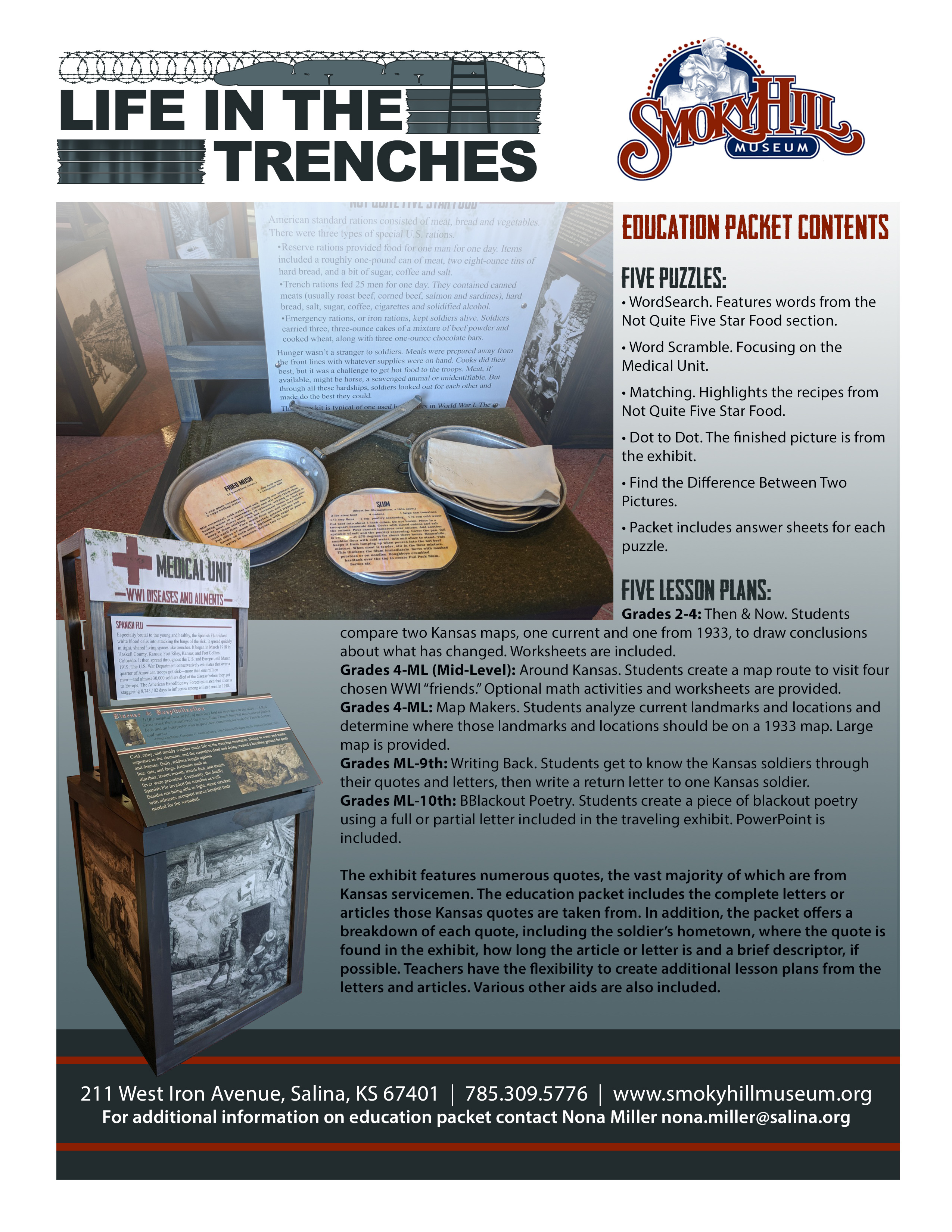 Originally an exhibit about Company M of Salina, Life in the Trenches morphed into a traveling exhibit focusing on the miserable nature of the trenches using vivid, first-hand accounts from Kansas soldiers of their ordeals, trials, and tribulations.